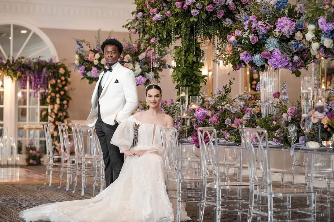 Held at the prestigious Hilton Christiana, in Christiana, Delaware in the grand ballroom the decor was full of lush florals,chandeliers and candles to create a sense of opulence.  While their guests were enjoying champagne and hours d’oeuvres, the couple was elated about their custom design, welcome sign and fountain.  The pinks and purples colors were used to create the perfect combinations to match the Bridgerton Theme.  Guests were blown away by the total experience of the room as the couple requested to create this stunning design.