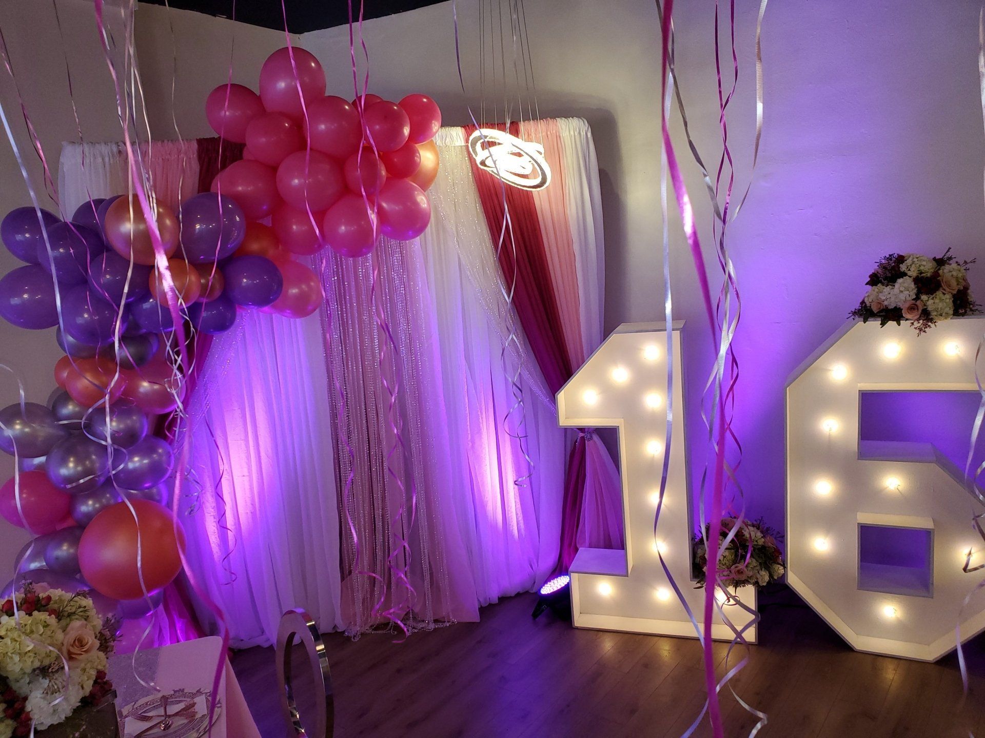 Kelly’s daughter was so relaxed and natural in front of her photo booth. We were impressed with how they followed our advice, allowing us to create stunning decor for her special day. You could see the love her family had for her when she arrived. We also were able to surprise her daughter with an elite party bus at the end of the night for her and her guests that were hanging out with the Birthday Girl. The deep purples and pinks along with the lighting really popped against all of the white walls in the venue. We were delighted to have been of service to execute this dream event for Kelly’s daughter.